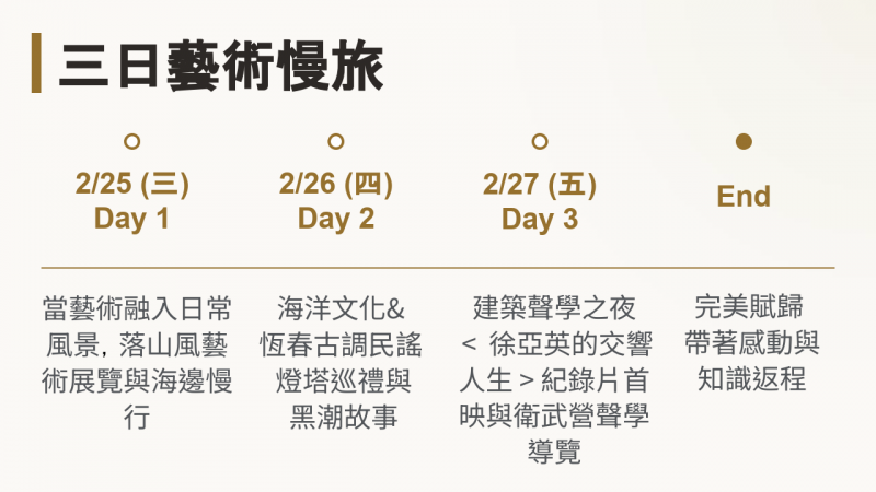 隨後轉往高雄衛武營,參與首度公開的聲學導覽,解析建築美學。最終於歌劇院觀賞聲學大師―徐亞英紀錄片《讓建築歌唱》首映,耗時11年的製作,在 2.2 秒的震撼殘響中,品味藝術、聲音與風土交織的深層感動。